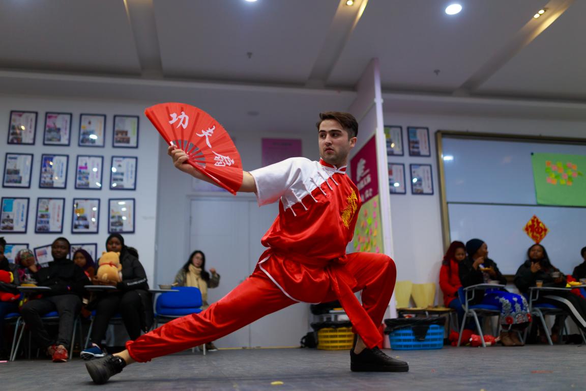 与会领导和老师们为每一位国际学生送上狗年吉祥物,与国际学生共进午餐,在温馨的氛围中听国际学生畅谈新春感想,欣赏他们表演歌曲和中国武术。塔吉克斯坦籍2017级商务汉语专业学生AMIROV RUSTAM说“今天,学校领导和老师们不顾假期专程赶到学校与我们一起过中国年,我真的很感动,也很感激。国际家庭大团圆的温馨氛围让这个时候我特别想念自己的家人,想与他们分享在中国过春节的切身感受。这是我从未有过的感觉,这或许是印证了中国古诗‘独在异乡为异客,每逢佳节倍思亲’吧。”
