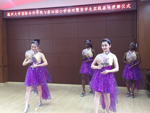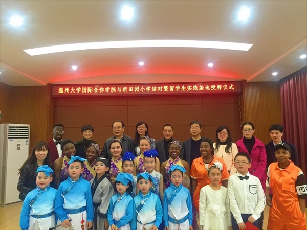 3月23日,温州大学国际合作学院副院长包含丽、办公室副主任廖一帆、学生科科长谢坚、留学生辅导员陈康豪等和来自意大利、加纳、津巴布韦、乌兹别克斯坦等7个国家的留学生参加了“温州大学国际合作学院与新田园小学结对暨留学生实践基地授牌仪式”,并同新田园小学的师生一起表演欣赏了富有中国文化特色的节目,为两校进一步开展国际理解教育奠定了合作基础。
