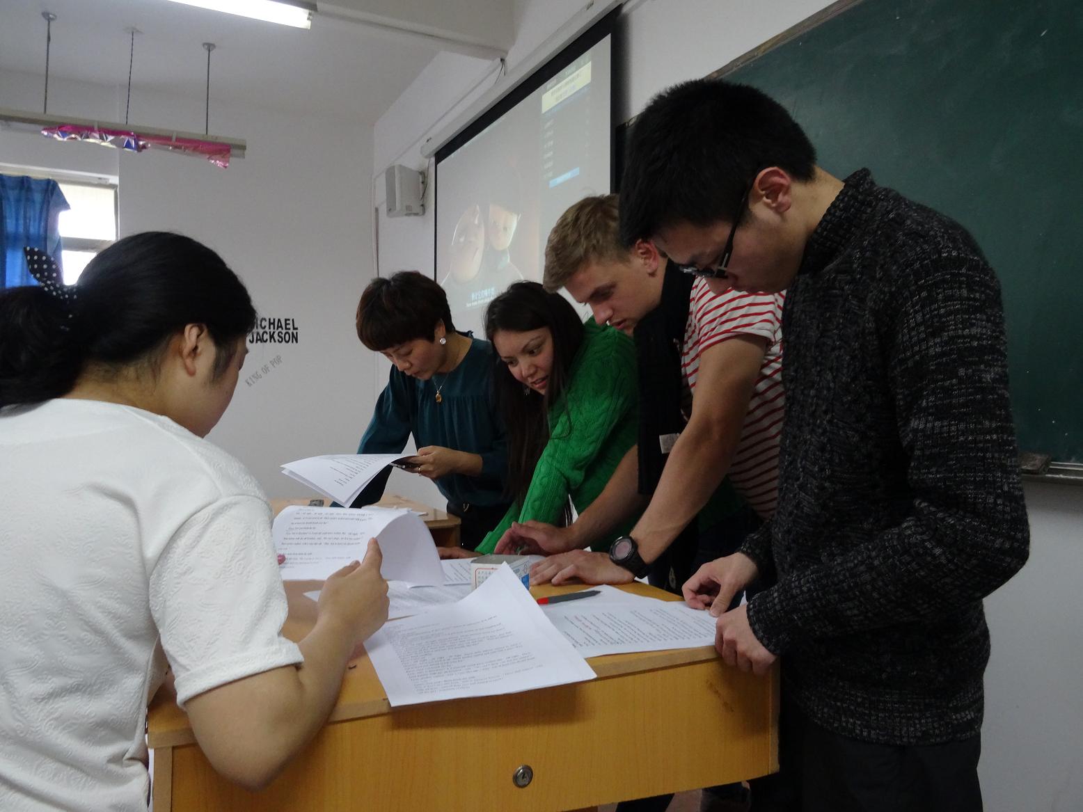 活动开始后,两位主持人——两岸13级学生刘彦夫与华裔美国留学生Alice同学分别用中英文向大家表示了欢迎,并详细介绍了规则。本次英语角以分组进行各类英语游戏形式开展,在主持人的安排下,参与者们分成了四个小组,其中每一小组皆由中国师生与留学生们按比例搭配。首先,各小组成员分别用英语作了自我介绍,组员们对自己的团队有了初步的了解。然后,大家进入第一个游戏环节——短句接龙。主持人分别向每小组第一位成员提供一段英文美句,后依次传接。在经过五位成员的传递后,部分小队得到了有趣的小句,在大家的欢声中,主持人根据句子的完整度评出了冠军小队。之后,是“绕口令”环节。五位积极的参与者来到幻灯前,经过短暂的准备后,在大家的鼓励中朗读了各自的小段。在保证准确发音的前提下,主持人为每位参与者进行计时并决出了优胜者。最后是配音游戏,其中的经典桥段分别出自著名电影《泰坦尼克号》、《冰雪奇缘》、《狮子王》、《神偷奶爸》。每小组分别选出几位成员扮演电影中的角色,并为电影配音。看着他们惟妙惟肖地表演,四位评委惊叹不已。