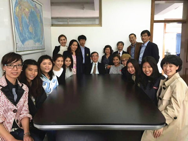 在座谈会上,国际合作院长严晓鹏与来访的泰国东方大学校长Sompol Pongthai、副校长Wirogana Ruenghrathuengsuka、孔子学院泰方院长Wilai Limthawaranun、人文学院院长Boonrod Boongird等一行六人共同回顾了两校多年来的合作历程,包括共同建设孔子学院,外派5名对外汉语教师赴泰参与汉语教学与中国文化推广活动,在温大举办3届来华汉语研修夏令营和秋令营的情况;着重介绍了汉语言文学专业(中泰合作3+1项目)四届共102名学生自2012年以来在我校认真学习汉语和中国文化、积极参与校园活动的精彩表现。严晓鹏院长表示,希望温州大学和泰国东方大学的合作项目能长期稳固发展,两校在联合培养学生之余也能更多开展学术合作研究,并向来访客人赠送了著作《孔子学院与华文学校发展比较研究》一书。东方大学孔子学院泰方院长Wilai Limthawaranun代表东方大学对两校联合培养”3+1”模式进行了高度评价并对我校表示了感谢,她表示联合培养的学生汉语水平提高显著,学生们对温大的教学、学生管理印象深刻,感谢温大的老师悉心教导。