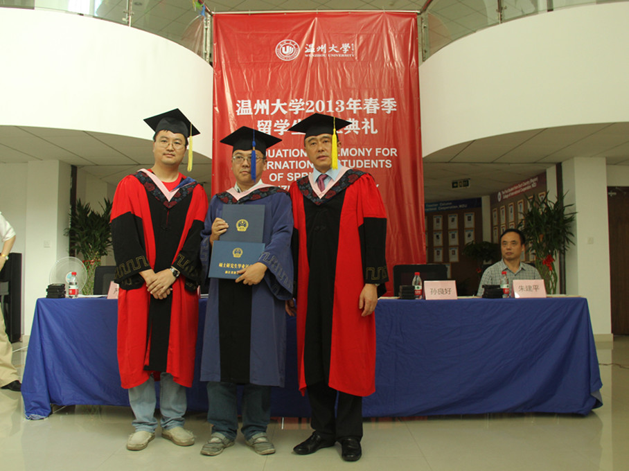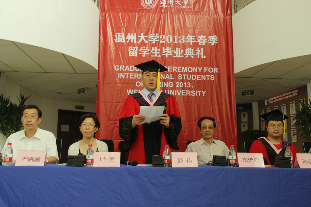 6月28日下午,温州大学2013年春季留学生毕业结业典礼在温州大学专家楼三楼大厅举行。副校长薛伟,原温州市外事办主任孙小钏、外事处处长叶苗,人文学院副院长孙良好,国际合作学院党总支书记朱建平出席,参加典礼的还有来自日本的硕士研究生,来自美国的亚洲研究项目交换生,以及来自西班牙、不丹、刚果、南非、加纳等国家的语言班学生。典礼由国际合作学院院长严晓鹏主持。