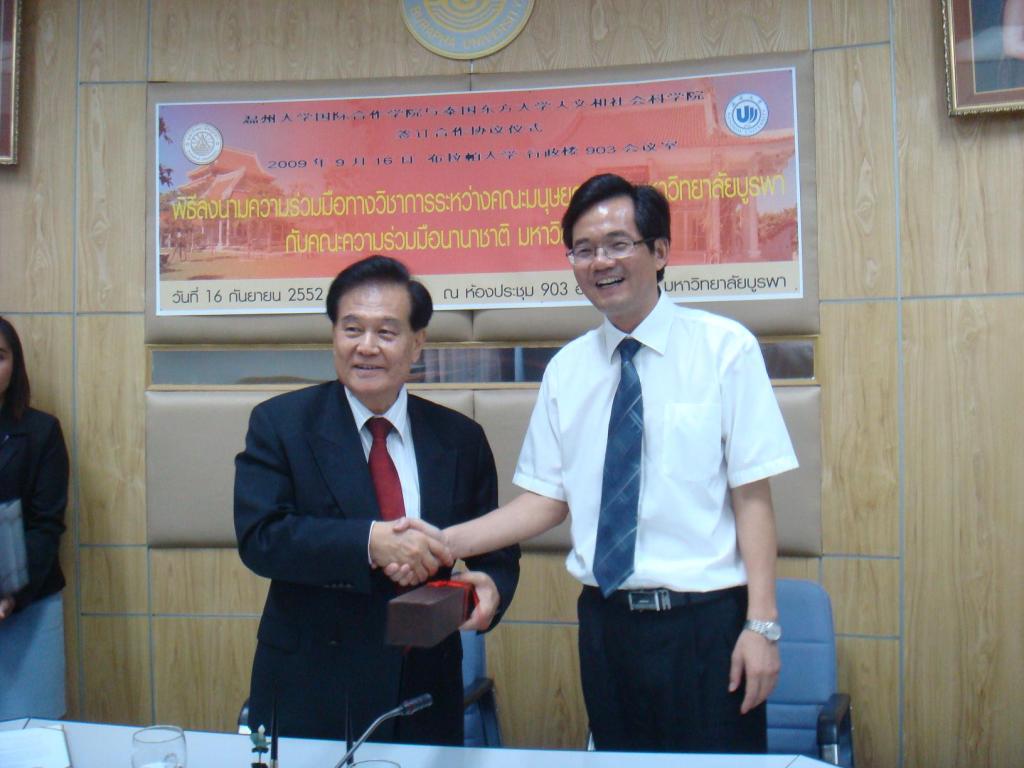 图为2009年9月,蔡袁强校长与时任东方大学校长Suchart Upatham签署《温州大学与泰国东方大学合作培养教育项目协议书》后握手共贺