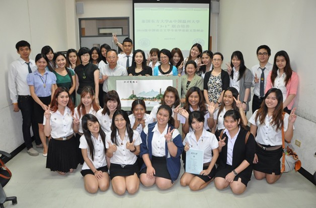 该校人文学院副院长Kanokporn博士在充分肯定答辩学生表现的同时,也对我校与东大的中国语言文学本科专业联合培养”3+1”模式进行了高度评价。该项目由温州大学蔡袁强教授2009年赴泰国东方大学参加孔子学院理事会期间签订,开拓了孔子学院合作院校之间开展学历教育联合办学的尝试,为浙江省首创。首批该项目26名泰国东方大学学历生于2010年9月完成在中国教育部网站的电子注册,先在泰国东方大学学习两年后,于2012年3月进入温州大学国际合作学院进行为期一年的专业学习。就读期间,他们主要课程为汉语口语、汉语写作、中国文学、中国书法和太极拳、剪纸、编织等,通过课程平移,学分共享,教师资源共用,形成了有特色、有成效的国际化课程体系。此外,他们还积极参与各类中国文化体验活动,并举办宋干节等富有泰国特色的系列活动,为我校校园文化注入了异国色彩。
