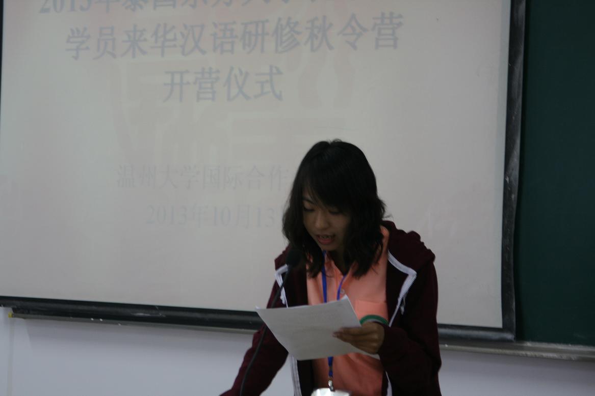 泰国东方大学营员代表蓝莎莎用熟练的汉语表达了对温州大学师生的感谢,并表示一定会和所有营员们一起遵守秋令营的纪律和有关规定,多向老师们请教,多与温州大学的中国同学和世界各地留学生朋友们交流学习。