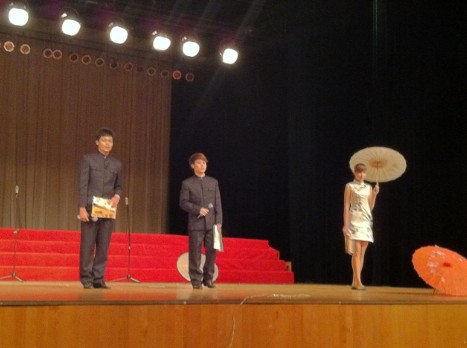 之后出场的是来自泰国的留学生何龙、严树民与来乌克兰的喀秋莎同学组成的参赛小组。他们的表演将比赛推向了另一个高潮。素雅的舞台,精致的油纸伞,一首极富江南气息的《雨巷》带给观众一种朦胧而又幽深的美感,令人向往,给观众留下了驰骋想象的广阔天地,感到诗的余香和回味。何龙、严树民同学流利的普通话令人刮目相看,喀秋莎更是将诗中的“结着愁怨的姑娘”演得淋漓尽致,极具异域风情。