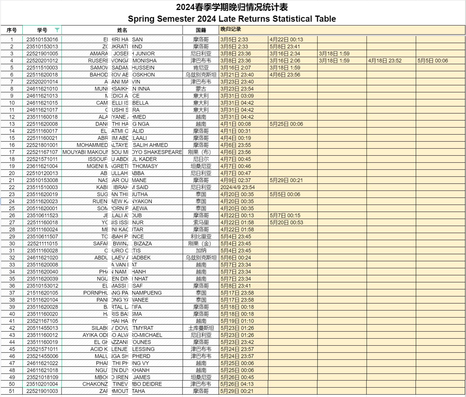 以下名单中的学生自开学来多次晚归,学院决定在院内公开通报批评,其中AMARAN JOSEPH JUNIOR、RUSERE VONGAI MONISHA两位同学因为多次晚归,学院根据温州大学国际学生违纪处分规定(2020年修订)第二章,第二十四条,第五点给予警告处分。希望大家引以为戒。