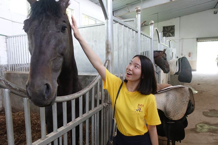 在专业的马术教练带领下,营员们首先来到马厩参观,教练向营员们介绍,这里有来自丹麦的纯正血统的马,体态高大威猛,他们有完美的奔跑和跨越能力,甚至可以轻松越过两米高的障碍物;也有来自西班牙、荷兰的混血马,温顺友善。营员们轻抚马匹油亮的皮毛,与名驹合影,喜爱之情溢于言表。