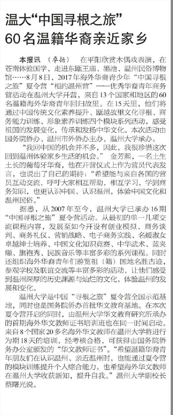 温州华裔青少年寻根之旅夏令营