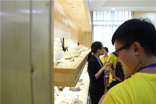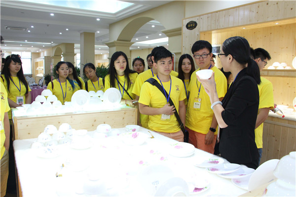 接待人员首先向营员们介绍公司概况,该公司是一家集陶瓷餐具生产销售、陶瓷餐具翻新修复和陶瓷品修复技术研发、培训和供应修复材料以及技术合作于一体的综合性企业,其掌门人卢成堆,是温州青年商界的领袖人物,没有富二代的背景,学生时代开始创业,用4年的时间将补碗的小企业发展到在浙江股权交易中心挂牌。听了关于卢成堆董事长励志的创业故事,营员们纷纷表示钦佩和赞许。接着营员们参观了瓷爵士公司的温州瓷文化创意园,据介绍,当前“瓷爵士”采取线上线下相结合的O2O模式,重点打造日用陶瓷垂直电商平台和线下陶瓷用品购物中心,创意园集陶瓷餐具、茶具、艺术品等销售和陶瓷文化宣传为一体。营员们一边参观,一边向工作人员询问有关订单管理、客服接待、售后服务、企业优势及其他公司运营的相关情况。