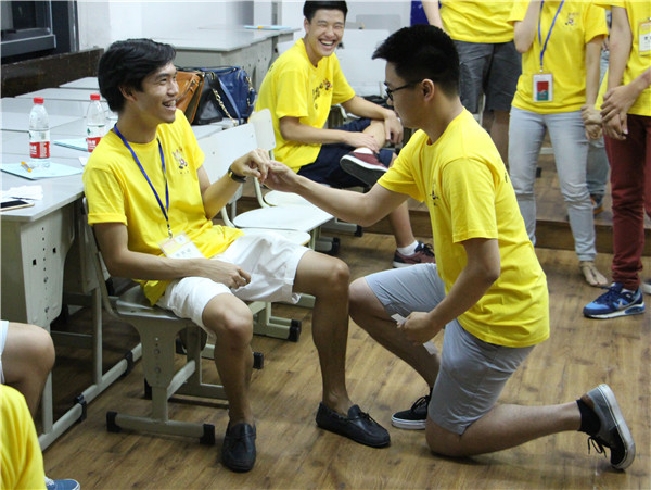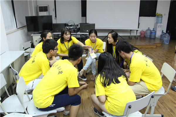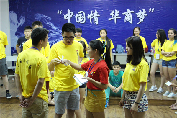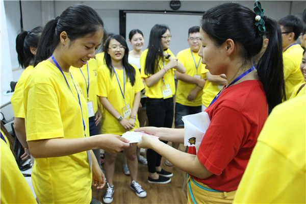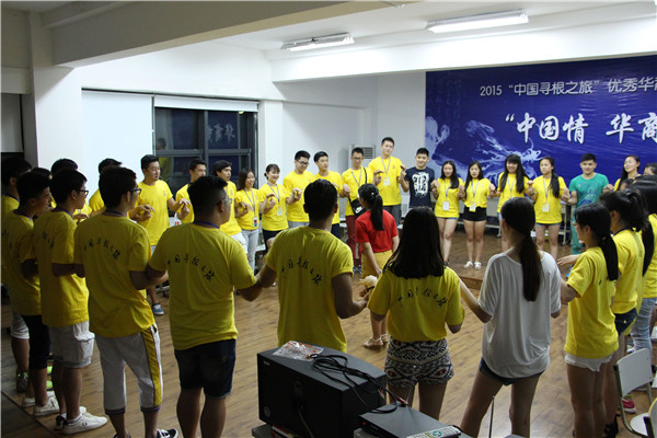 一年一度的寻根之旅夏令营不仅是各国华裔青年们了解家乡历史、文化、经济的重要途径,也是他们互相结识交流、建立友谊的良好平台。为了促进营员间的相互认识和了解,培养营员们的团队协作意识,并建设夏令营的营员自主管理团队。为了让营员们尽快融入营地大家庭,培养他们团队协作意识,组建自主管理团队7月12晚上,2015年华裔青少年“中国寻根之旅”夏令营——“中国情、华商梦优秀华裔青年商务营的老师们为营员们精心设计了了一段破冰之旅。