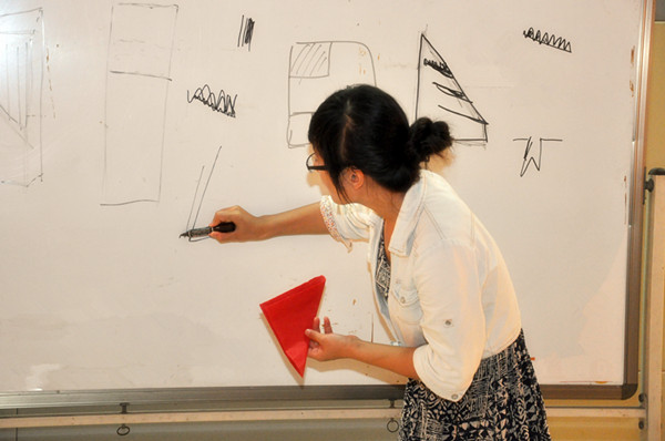 温州大学的刘菲菲老师讲解和示范了“囍”字、锯齿和团花三种常见的剪纸形式,让营员们掌握剪纸基本的折纸方法如对折法、三折法,在讲解过程中穿插剪纸艺术的历史发展和艺术演变等知识,并引导营员们自己DIY团花的纹样,鼓励营员们发挥自由想象力。在上课过程中,刘老师还与营员们分享了剪纸在生活应用中的小趣事,展示了世界各国不同的剪纸风格和技艺。
