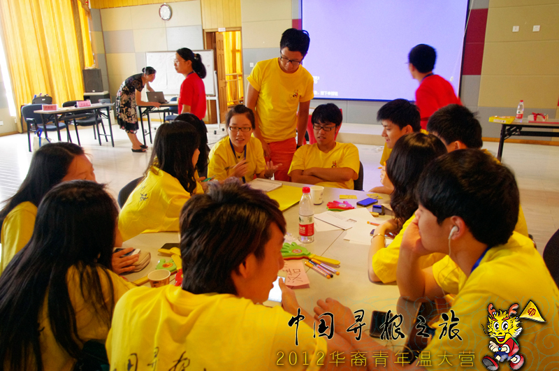 讨论会由温州大学华文教育研究所副所长、国际合作学院办公室主任包含丽老师主持,包老师和在场的其他老师首先做了示范,并宣布了比赛规则。营员们分成四组,在抽取了主题后,每组配备一名指导老师。中华组和Dream Team两组抽到的主题分别是“汉语”、“青年”,这两个主题赠送10分幸运分,惹得另外两个抽到“幸福”、“乡情”的队大呼派去抽签的队员手气不佳。