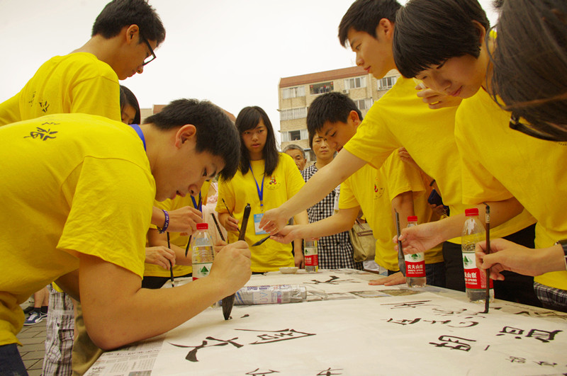 老年书法家现场为大家展示中国书法,老书法家挥毫写下“中国龙”苍劲有力的大字,引得大家大声喝彩。营员们很多在国外学过书法,急忙向老先生请教,迫不及待地要大显身手。有些第一次写毛笔字的营员也急切地拿起毛笔想要试一试中国古人怎样写字。大家写毛笔字写得兴致浓厚,手上沾满了墨汁还特别开心!老书法家将自己写的作品送给了营员,营员视若珍宝,说回家后要送给家里的爷爷奶奶,因为他们很喜爱祖国传承了千年的书法。
