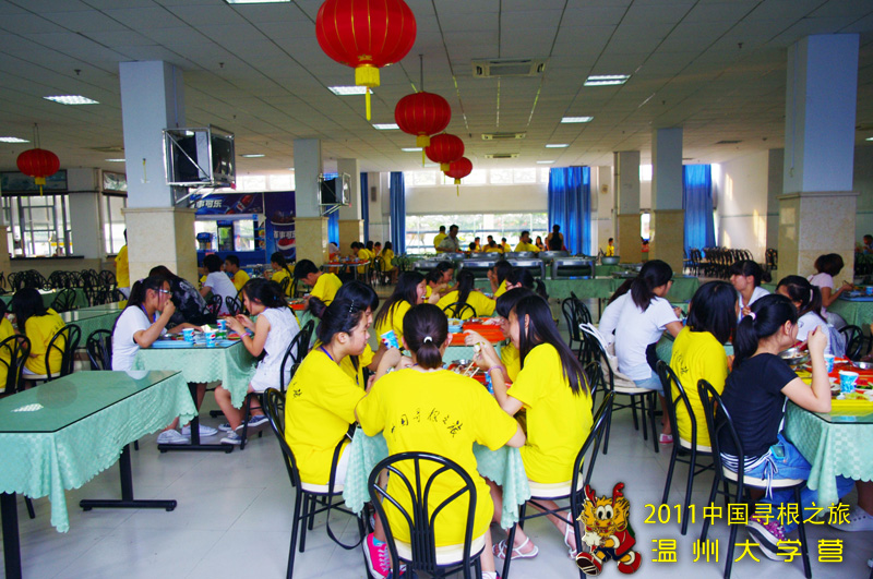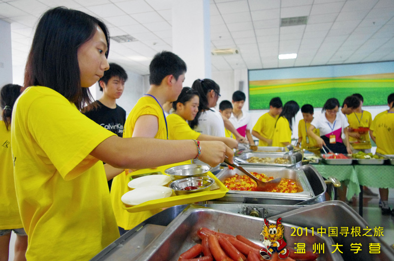 每天随着下课铃声的响起,在2011海外华裔青少年“中国寻根之旅”夏令营温州大学分营的餐厅里,便开始热闹起来。营员们次序尽然地排好队伍,签到,拿盘,打餐。