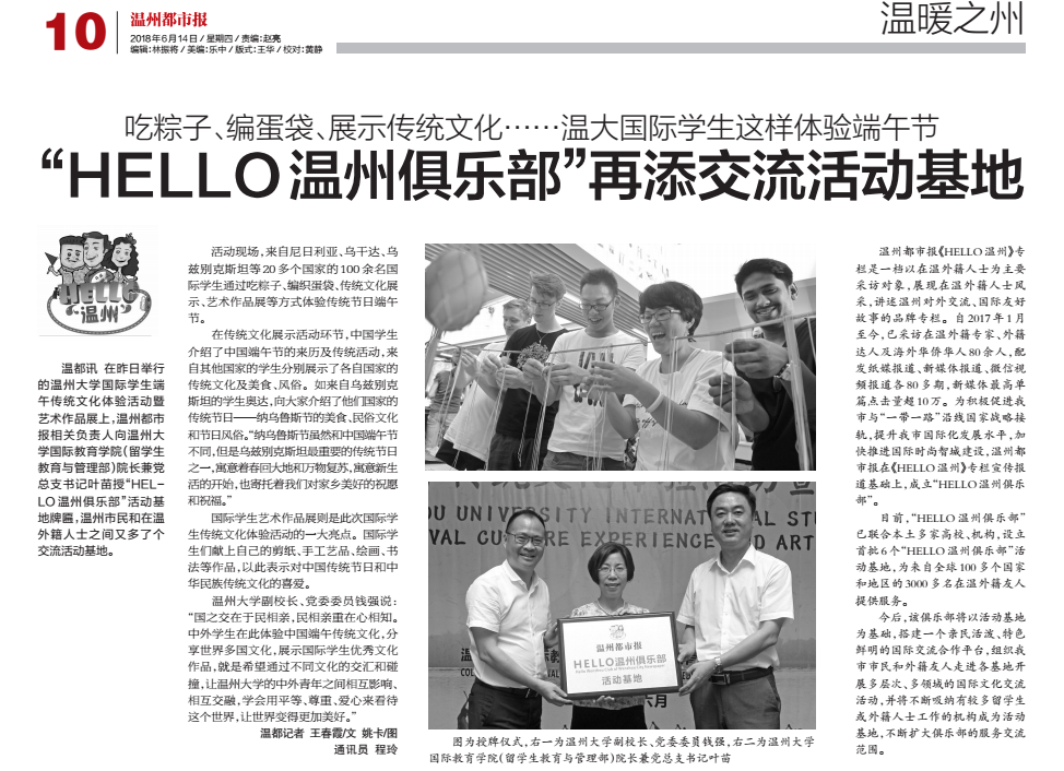 温都讯 在昨日举行的温州大学国际学生端午传统文化体验活动暨艺术作品展上,温州都市报相关负责人向捷报即时比分网