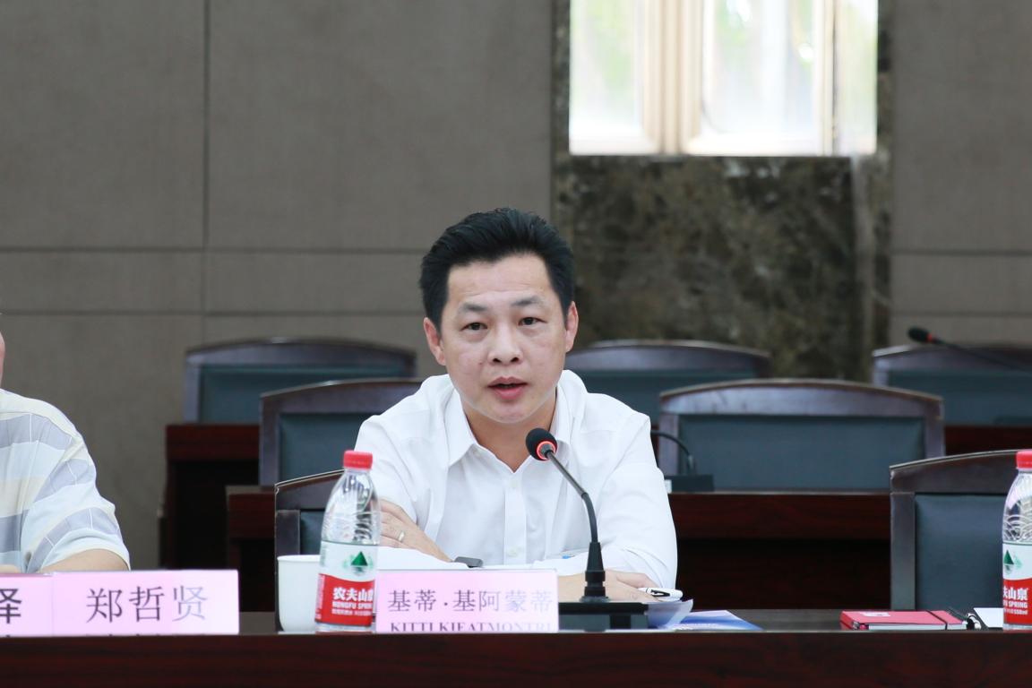 在听取介绍之后,泰国罗勇府行政局基蒂·基阿蒙蒂副主席表示深感荣幸此行访温有机会与各主要高校探讨中泰人才培养与学术交流,他介绍了泰国罗勇府概况,并指出:商贸是推进一个城市与国际接轨的重要途径,语言则是国际商贸活动中最重要的工具;罗勇府政府部门专门成立了罗勇府行政局语言中心,为当地学校提供中英泰三语教学师资培训。他希望与温州开展汉语师资培训与教育文化交流方面的合作。