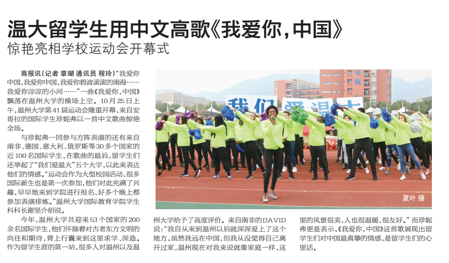 商报讯(记者章瑚 通讯员程玲)“我爱你中国,我爱你中国,我爱你碧波滚滚的南海……我爱你淙淙的小河……”一曲《我爱你,中国》飘荡在温州大学的操场上空。10 月25 日上午,温州大学第41 届运动会隆重开幕,来自安哥拉的国际学生珍妮弗以一首中文歌曲惊艳全场。