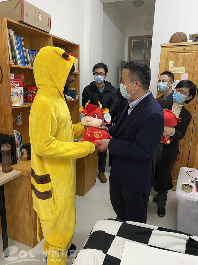 谢树华在寝室向留学生送上新年的问候和美好的祝愿,嘱咐大家要牢记和遵守疫情防控要求,保护好自身健康,利用假期时间多学习中文,学习中国文化,学习专业知识,不断充实自己。要和远在异国他乡的家人保持联系,让家人了解自己在温州大学生活学习情况,让家人放心;要和老师多多交流学业上和生活上的疑惑、困惑,不断获得成长。