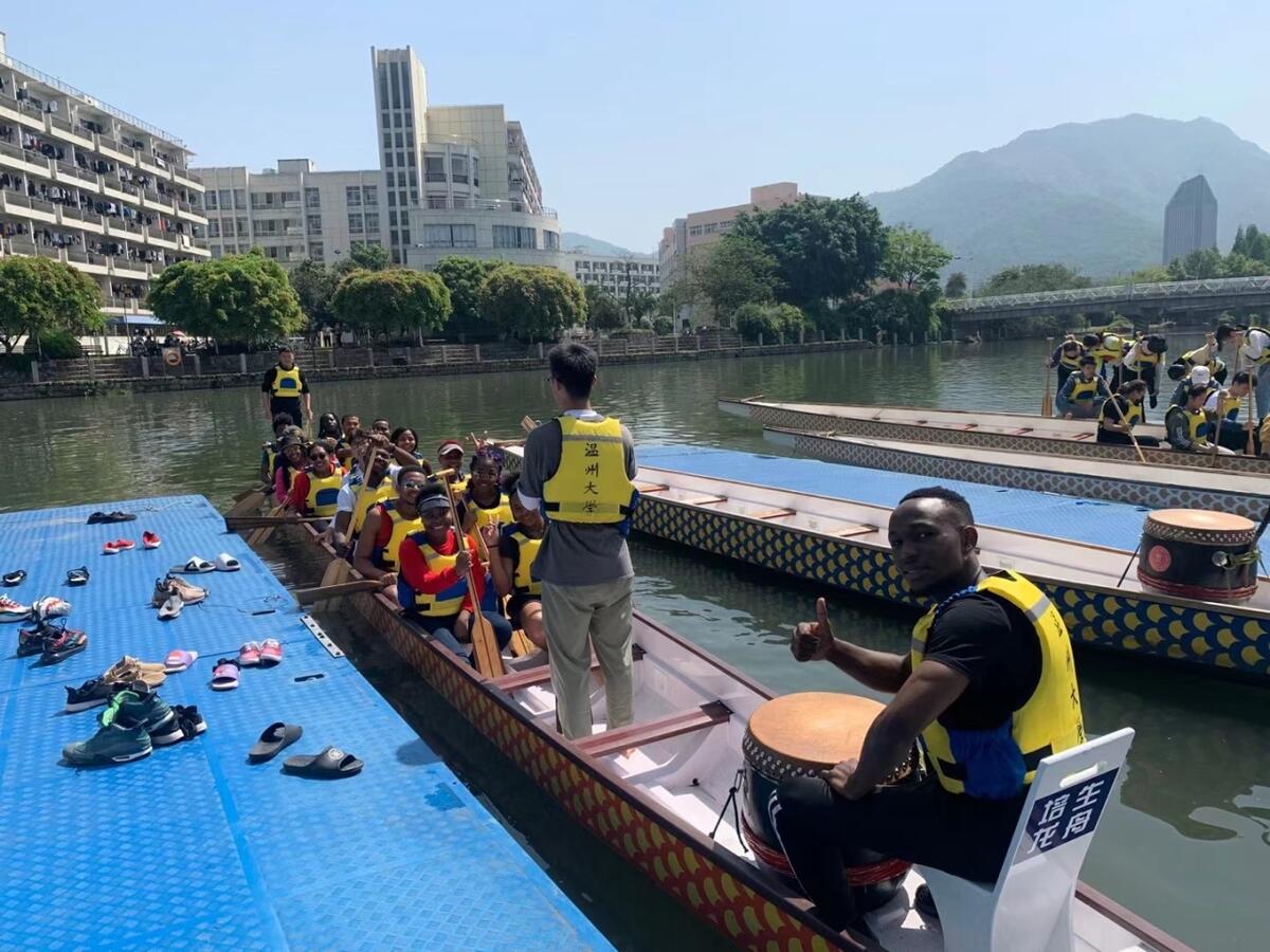 浙江在线4月25日讯(通讯员 程玲 林爱菊)鼓点声、口号声、加油声、欢笑声……周末的温州大学龙舟基地显得格外热闹。13名不同肤色、语言迥异的留学生和中国传统体育运动——划龙舟,碰撞出绚烂的火花。在温州大学龙舟基地训练现场,来自津巴布韦、肯尼亚、赞比亚、尼日利亚等11个国家的留学生组成温州大学首支留学生龙舟队,准备参加学校第一届校园龙舟赛。除了这项传统体育项目之外,学院还组织留学生在课余时间学习太极拳、南拳等中国传统武术。