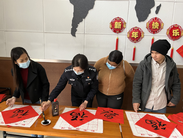 张珉璐老师用中英文向留学生介绍中国贴春联的传统习俗,在墨香四溢与红色喜庆中,领导老师耐心地指导留学生用毛笔写下一个个大大的“福”字,一句句工整的对联,寓意新年福临,寄托美好愿景。留学生徜徉在中国传统文化与新春热情洋溢之中。