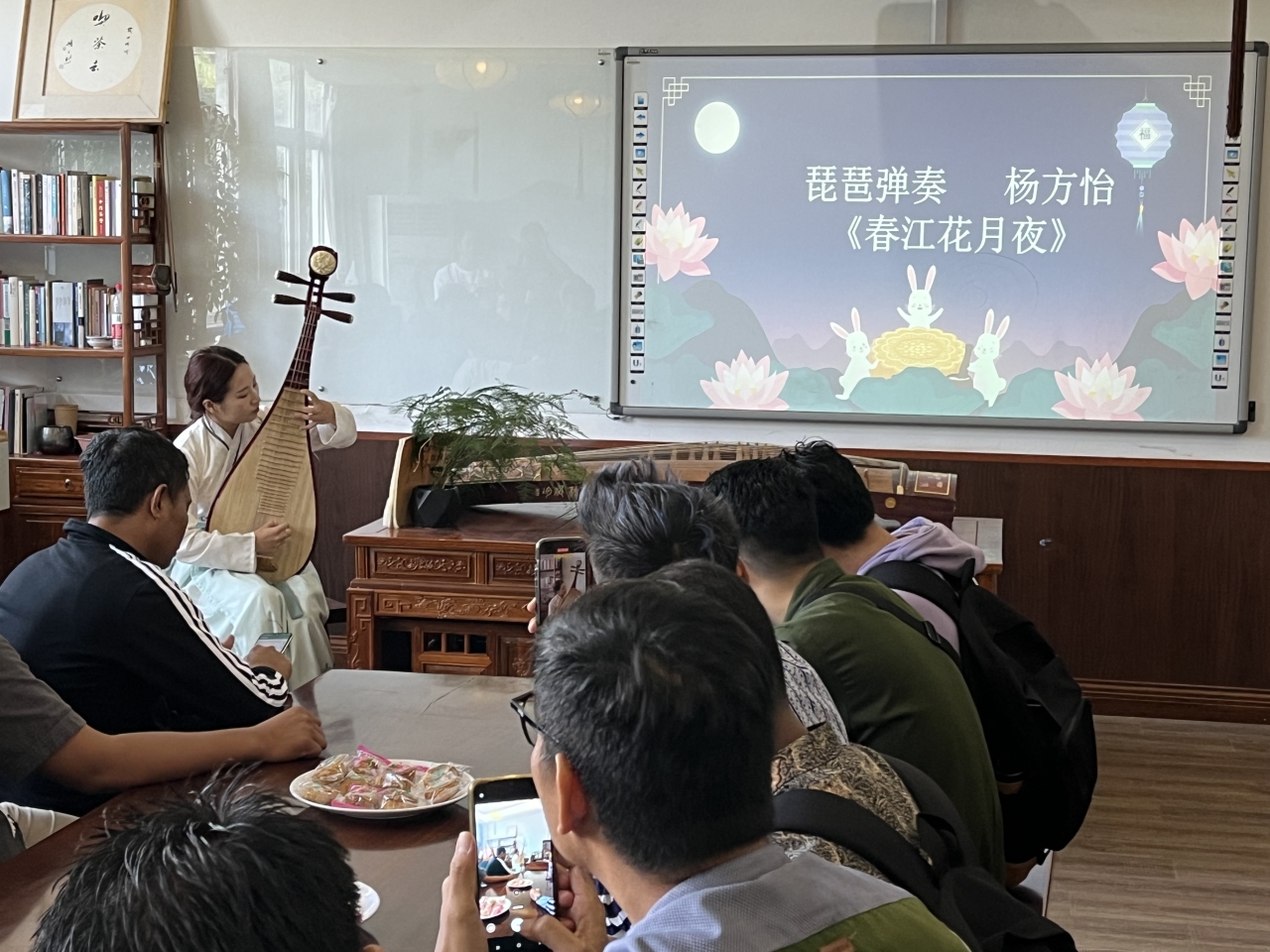 “你了解中国的中秋节吗?”“中秋节有哪些习俗?”……活动在互动提问中拉开帷幕,温大国际中文教育研究生樊知易向留学生介绍中秋节起源,作为古老“祭月”文化的遗存,中秋象征着丰收的喜悦和团圆的期盼,“后羿射日”和“嫦娥奔月”的传说让留学生深感奇妙。指导老师还向留学生介绍赏月、吃月饼、团圆饭、中秋观潮、赏桂等中秋节传统习俗。随后,留学生饶有兴致地试穿汉服、学习礼仪,沉醉在汉服之美和中华优秀传统文化的大雅华章之中。他们不仅身着汉服互相合影,还在现场与远在海外的亲人视频连线,表达思念之情。活动还邀请温大国际中文教育研究生杨方怡演奏琵琶曲《春江花月夜》。