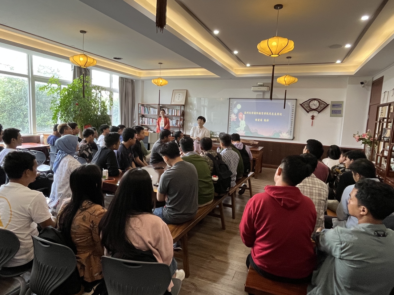 举行中秋文化体验活动,来自印度尼西亚的48名温大青山班学员与温州大学学生代表欢聚一堂,共迎佳节。