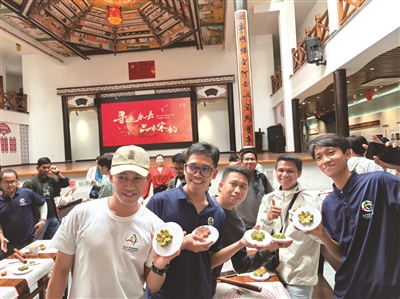 水云村糕点师林乐琼,一袭汉服装扮,在水云村党群服务中心为印尼的学员们带来了一场别开生面的“宋韵茶果”制作体验课程。揉面、和馅、定型、烤制……只见在林老师的带领下,洋同学们用面团制作了各式形状、不同口味的“桃花”雏形,呈现出一幅花团锦簇的模样。“第一次给外国人上课,挺紧张的,但是想到能把中国传统文化传播出去,特别开心!”课程结束后林乐琼对记者说道。
