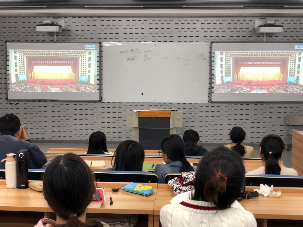 在北校区三号楼201教室组织全体师生观看了由中国科学技术协会、教育部、中国科学院、中国社会科学院、中国工程院、国家自然科学基金委和北京市政府共同主办的2018年全国科学道德和学风建设宣讲教育报告会。本次报告会以“习近平新时代中国特色社会主义思想为引领,大力弘扬新时代中国科学家精神和爱国奋斗精神”为主题,贯彻落实习总书记关于科学道德和学风建设的重要指示。