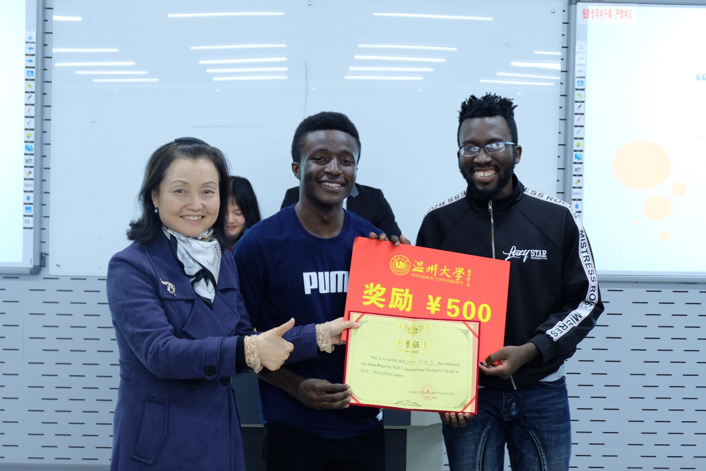 在北校区3号楼201举办首届国际学生“留学温大”微电影大赛。汉语教研室张丽丽、徐丽丽、张珉璐老师,学生科谢坚老师及80余名国际学生参与此次活动。