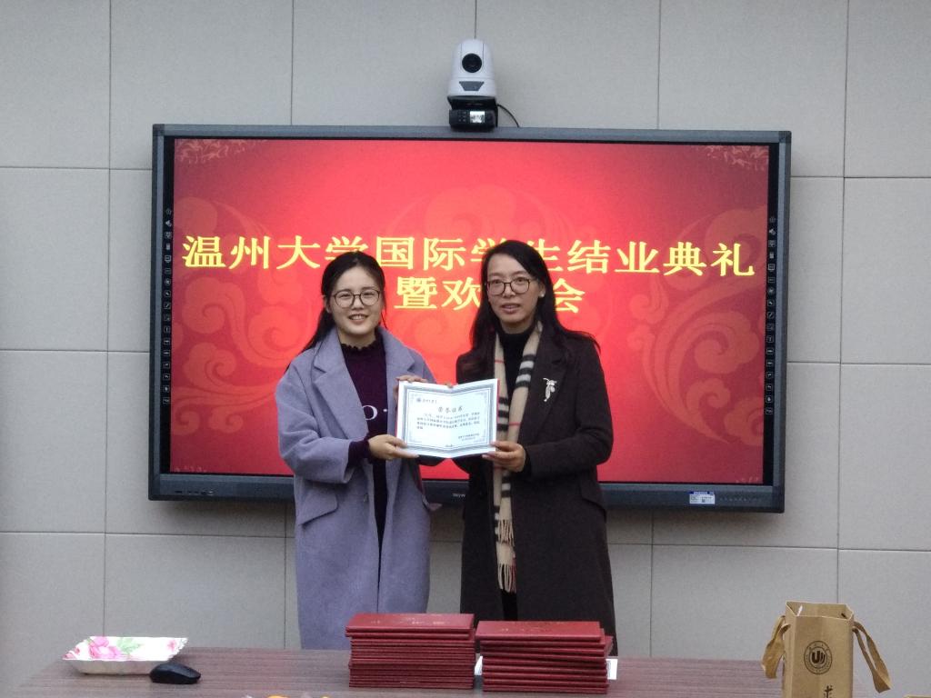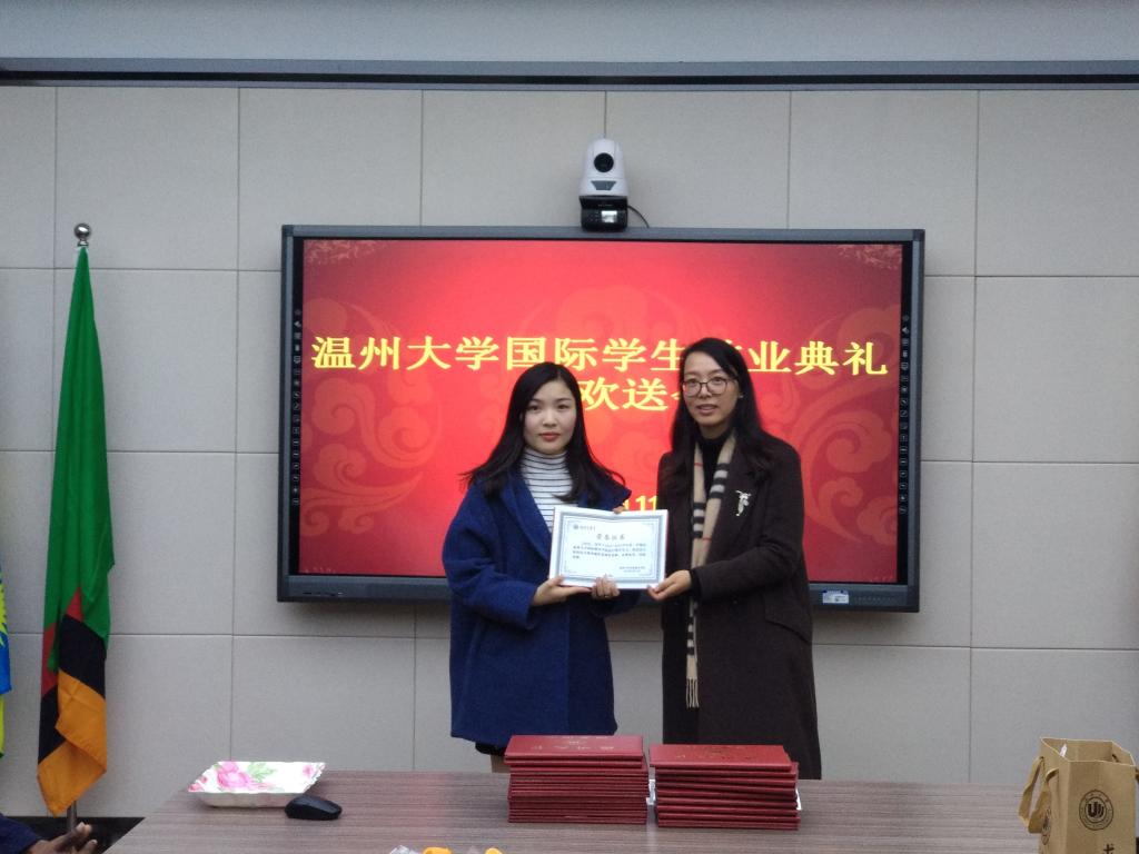 包含丽副院长为结业学生颁发结业证书和学院纪念品,为来自韩国、意大利、尼日利亚的结业学生颁发校友联络员证书,并为两位实习老师颁发“优秀实习教师”证书。她提到,希望各位校友联络员积极地与学校及各国校友联系,在自己的国家组织校友开展活动,将温大精神传播到世界各地。同时,她希望各位结业学生努力学习汉语,向自己的家人和朋友讲述中国故事,讲述在温大的故事。希望各位结业的“温大人”常回家看看,“温州大学是你们永远的家”。