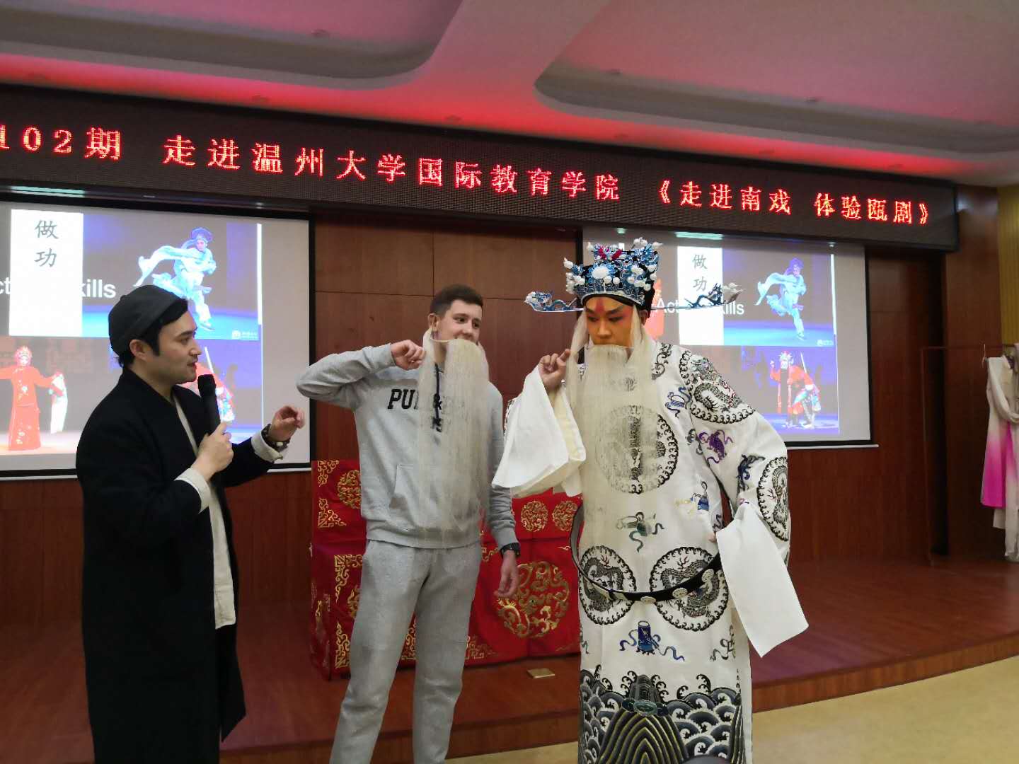 4月12日晚,讲座开始。方老师用他诙谐幽默的讲解、趣味十足的互动为来自五湖四海的留学生们开启了瓯剧艺术的第一次亲密接触。在这堂特殊的东方文化课上,方汝将老师通过演员们全副武装的扮相和婉转动听的唱腔让留学生们领略Wenzhou Opera的独特魅力,通过分解戏服和瓯剧表演程式把瓯剧艺术的基本知识轻松代入,通过“生、旦、净、末丑”五种行当的角色依次登场展现出瓯剧的活色生香,通过邀请留学生上台学“把式”和化全妆等形式打通了戏曲艺术的隐形国界。国际学生们听得津津入味,踊跃举手要求尝试瓯剧表演基本动作,并将“耍花枪”“舞袖”“起码”“转佛珠”等唱、念、做、打几项动作演绎得惟妙惟肖。讲座现场,不时爆发出雷鸣般的掌声。
