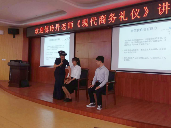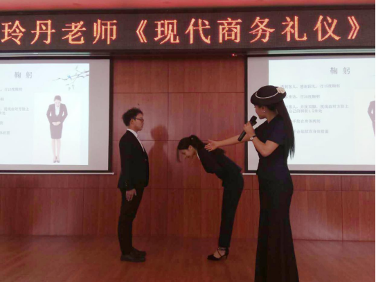 傅老师从微笑、握手、鞠躬、递接名片、相遇礼仪、介绍礼仪、电话礼仪、称呼礼仪等不同方面向我们详细介绍了社交礼仪的要点。期间,傅老师与师生们进行幽默有趣的互动,不仅邀请个别同学上台进行礼仪细节的示范并对其进行耐心指导,也让师生们随着讲座不时进行实地操练,让大家切身感受到商务礼仪重在平时的实践。