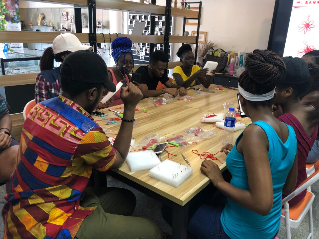 2019年5月23日下午,温州大学“走进温州”课堂的22位留学生们在老师的带领下来到大学生创业园的汝意饰品工作室,亲自制作了传统中国结。