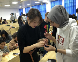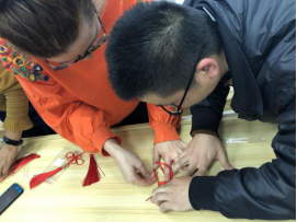 随后,老师通过亲手示范、PPT讲解、视频展示等多种方式教留学生们如何制作一个精美的吉祥结。大家专注而认真地学习,一个个都跃跃欲试。拿到制作材料后,同学们迫不及待地开始动手,不会就抬起头寻问老师如何做。老师们不一会儿就被“包围了”,活动场面十分红火,时不时地传出阵阵笑声。