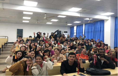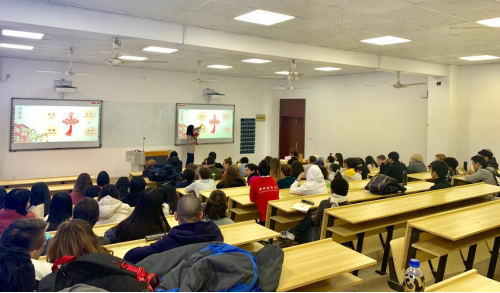 活动伊始,李晶老师图文并茂地向学生们介绍了中国结的“前世今生”和背后的寓意:“中国结始于上古,兴于唐宋,盛于明清。表达了人们的美好祝福和心愿,体现了人们对真善美的追求和渴望”。留学生们被蕴藏在一根根红线背后的文化深深地吸引了。“心似双丝网,中有千千结”,来自越南的陈氏玉印同学平时喜欢中国诗词,她非常准确地给大家诠释了诗意,赢得阵阵掌声。