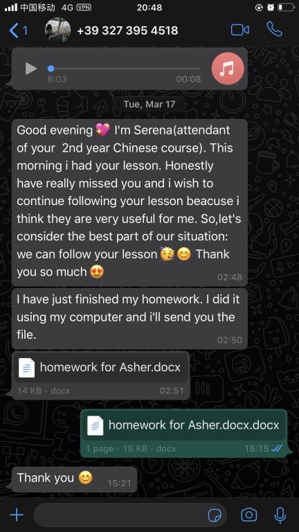 每一周,张珉璐都会精心把每个年级的两小时课程视频录制好,与音频、ppt、练习作业及一些额外的针对不同级别HSK的练习发送给意大利老师,意大利老师再上传至温州大学意大利分校的学习平台,学生通过平台下载视频和学习资料进行学习。
