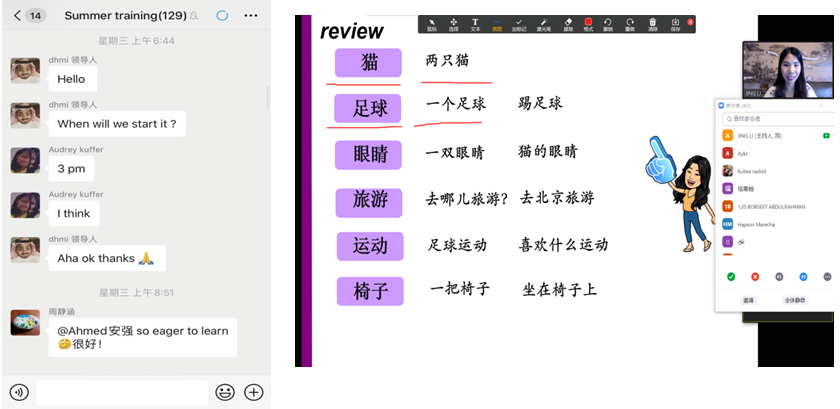 本次公益培训的内容主要是在HSK2级的基础上,逐步提升国际学生的汉语水平并通过HSK3级。考虑到已回国的学生因时差带来的不便,培训时间定在每个工作日的下午三点到五点。培训的方式主要是通过使用ZOOM软件在线教学并录下课程供学生回放观看。据悉,早在开课前一天就有120余人加入培训微信群,学生们在微信群里询问上课时间和内容,表现出了极高的学习热情,授课教师也在群里积极地与学生互动答疑。尽管此次培训没有学分的要求和考试的压力,但是学生们还是会按时上课、认真听讲。据授课教师说每次课后作业,学生都会按时提交。根据调查,学生们希望捷报即时比分网