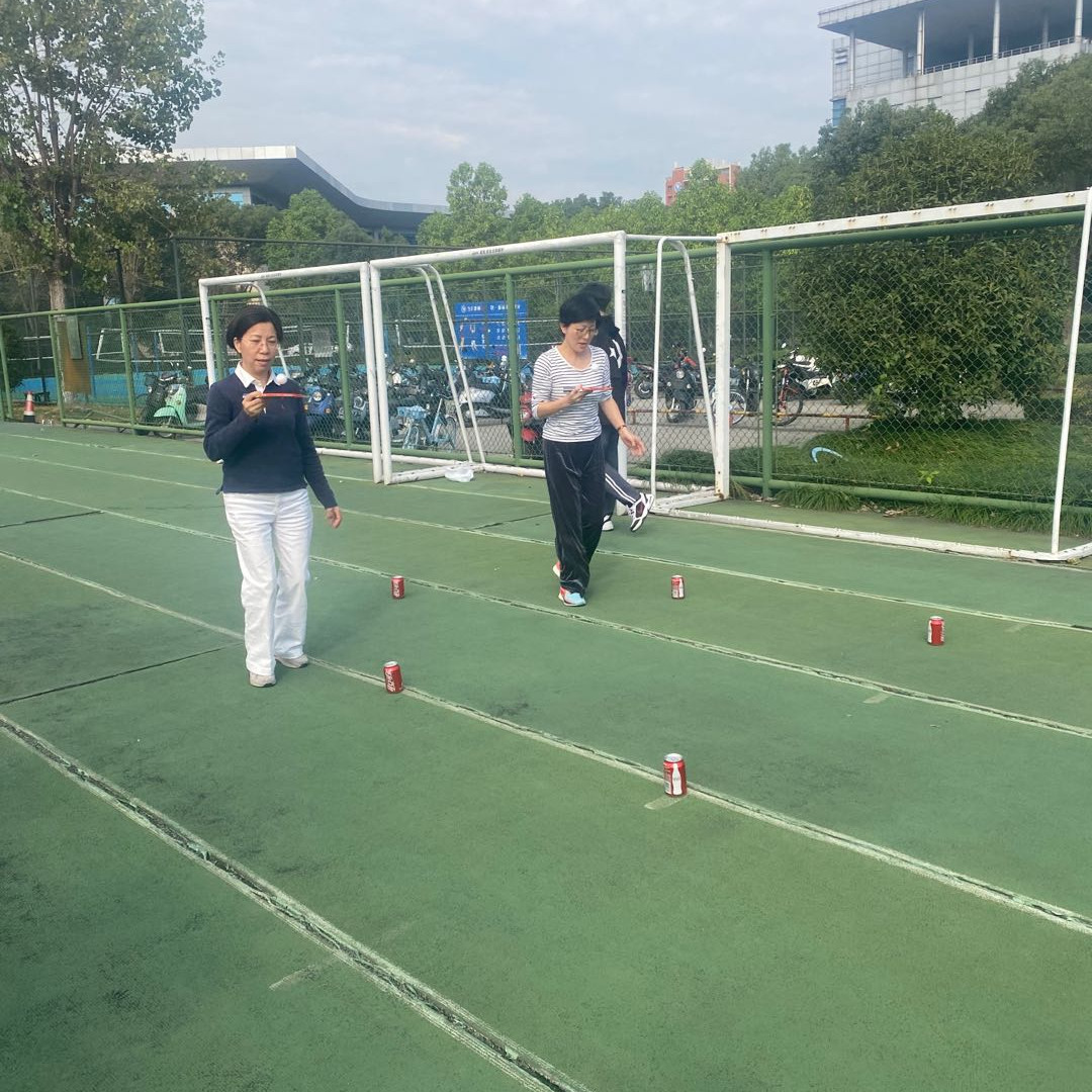 趣味运动会分四个项目:趾压板木头人,摸石过河,趣味前进射球赛和毛毛虫竞速。其中摸石过河和毛毛虫竞速最为有趣,师生们两人一组,每位参赛者脚底放置两块砖头,参赛选手听到裁判员发出“开始”口令后开始行动,提起左脚并拿起砖头放置前方,随后右脚提起并将右脚下砖头放置前方,如此往复,用时最短的一组获胜,师生们都纷纷铆足了劲往前冲。在毛毛虫竞速环节,中外学生和老师们一起合作,骑在毛毛虫上从足球场一端移动到另一端绕过障碍物后返回,用时最短一组获胜。