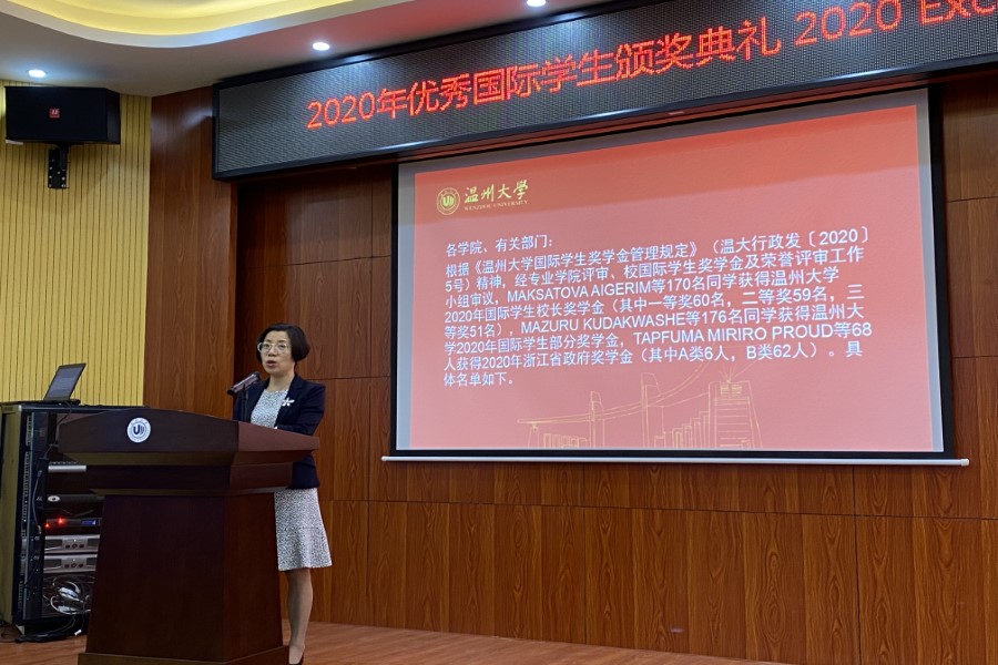 外籍教师Michael主持,第一项议程为叶苗院长宣读“关于公布温州大学2020年校长奖学金、部分奖学金和浙江省政府奖学金获得者名单”的文件,现场奖学金获得者看到自己的名字出现在屏幕上纷纷欢呼鼓掌。嘉宾们依次为优秀国际学生们颁发奖学金证书,奖学金代表AUDREY KUFFER、NKATA AARON和APPAU DAVIS分别发表了获奖感言,鼓励大家继续努力学习,只有脚踏实地才能有所收获。看着台上获奖学生脸上灿烂的笑容,相信接下来他们会再接再厉,取得更大的进步。