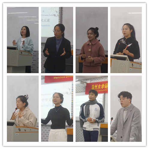 201教室举行。参赛选手以饱满的情绪讲述了自己最喜爱的中华文化元素,现场反应热烈,呈现了大学生对祖国文化的热爱。外国语学院纪翠萍老师、外国语学院周亚娟老师、外国语学院童芳莉老师、以及捷报即时比分网