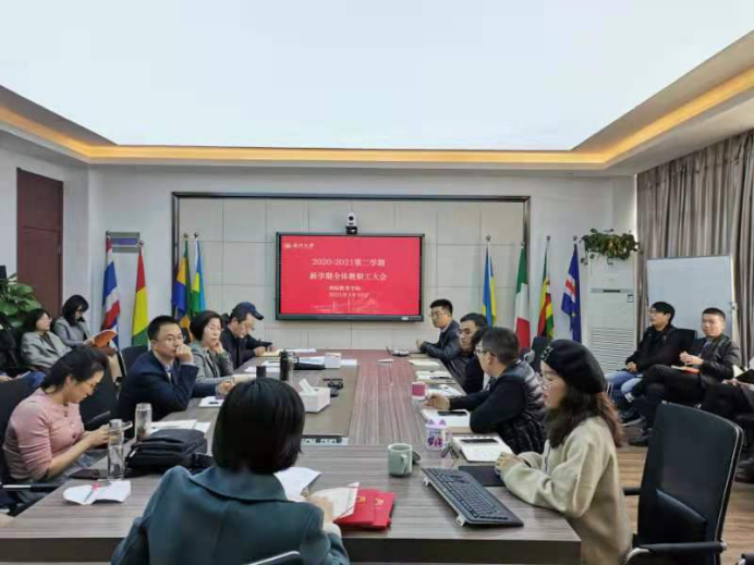 2020/2021第二学期新学期全体教职工大会在国际楼311会议室召开,会议由党总支书记林爱菊主持。