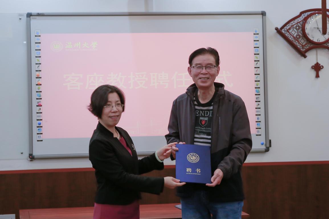 讲座结束后,叶苗院长为朱植德老师颁发了温州大学客座教授的聘书以感谢朱老师对我们的悉心指导,也希望朱老师能继续为IN WENZHOU双语杂志发光发热,为我中心的发展提供更大的支持。