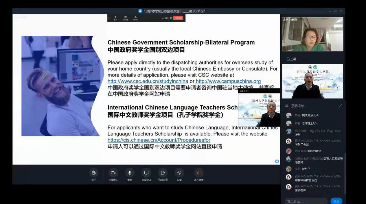 1月21日18:30,由留管部组织的“温州大学2022秋季入学说明会”在钉钉直播平台顺利举行。本次直播主要面向参加汉语桥的学员,其中以越南籍学生为主。 参加此次我校主办的汉语桥的学员们有着较强的中文基础,因此入学说明会全程使用中文进行宣讲。