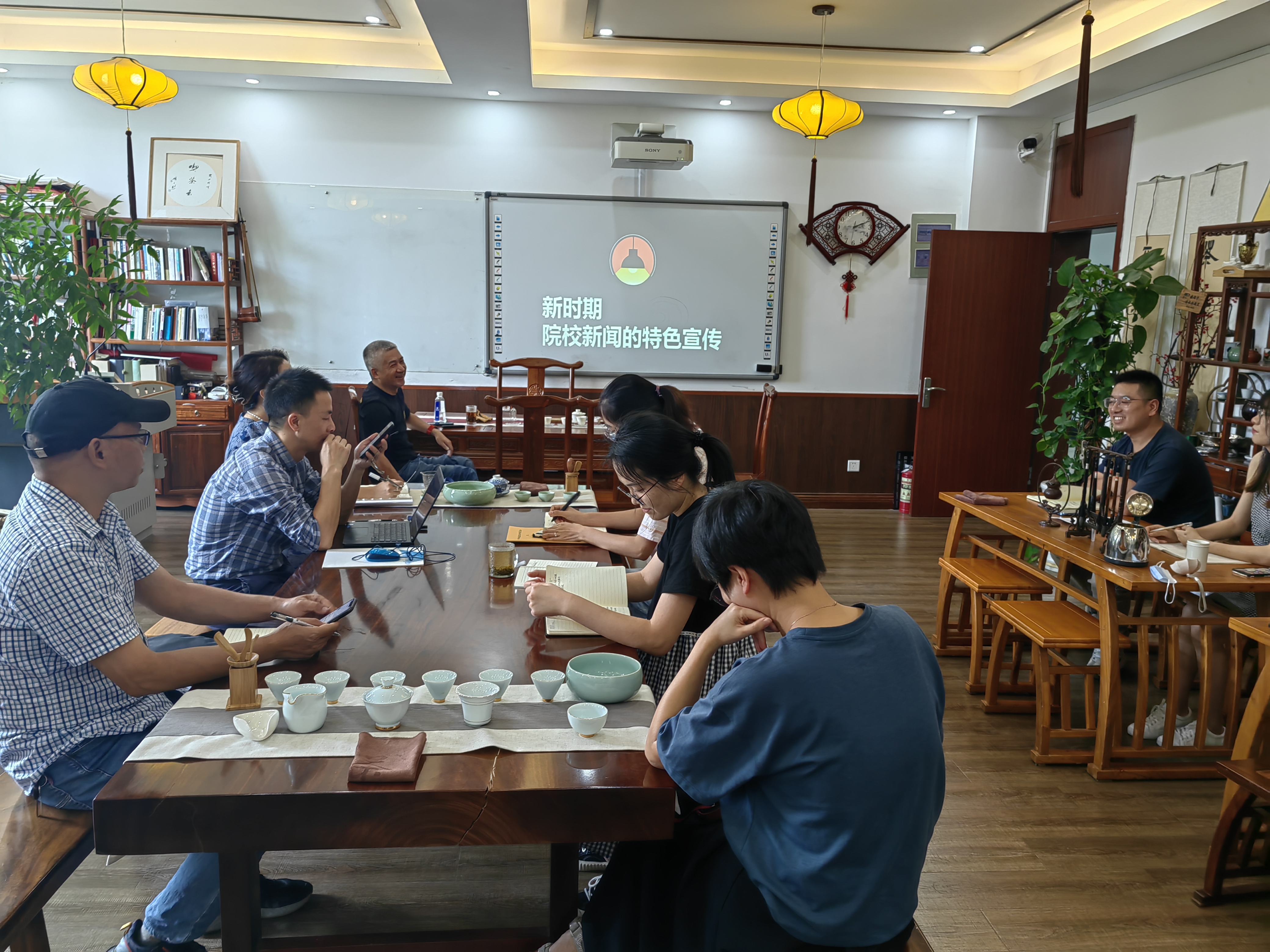 在二楼茶香国际开展“新时期院校新闻的特色宣传”专题讲座会,全体行政人员和部分汉硕学生参会,《浙江日报》记者江维海主讲。