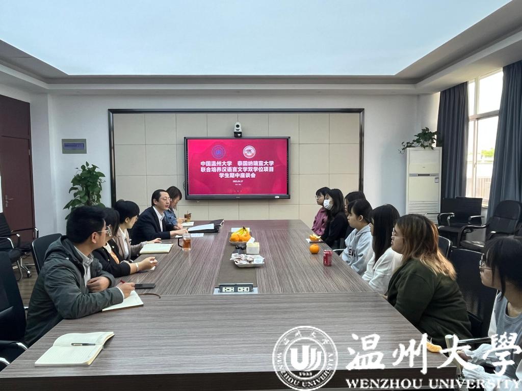 于4月27日上午在3-311会议室召开温州大学泰国纳瑞宣大学联合培养学生期中座谈会。学院党总支书记林爱菊、副院长熊勇、班主任张珉璐、招生科、学工办相关教师及7名项目学生参加会议。