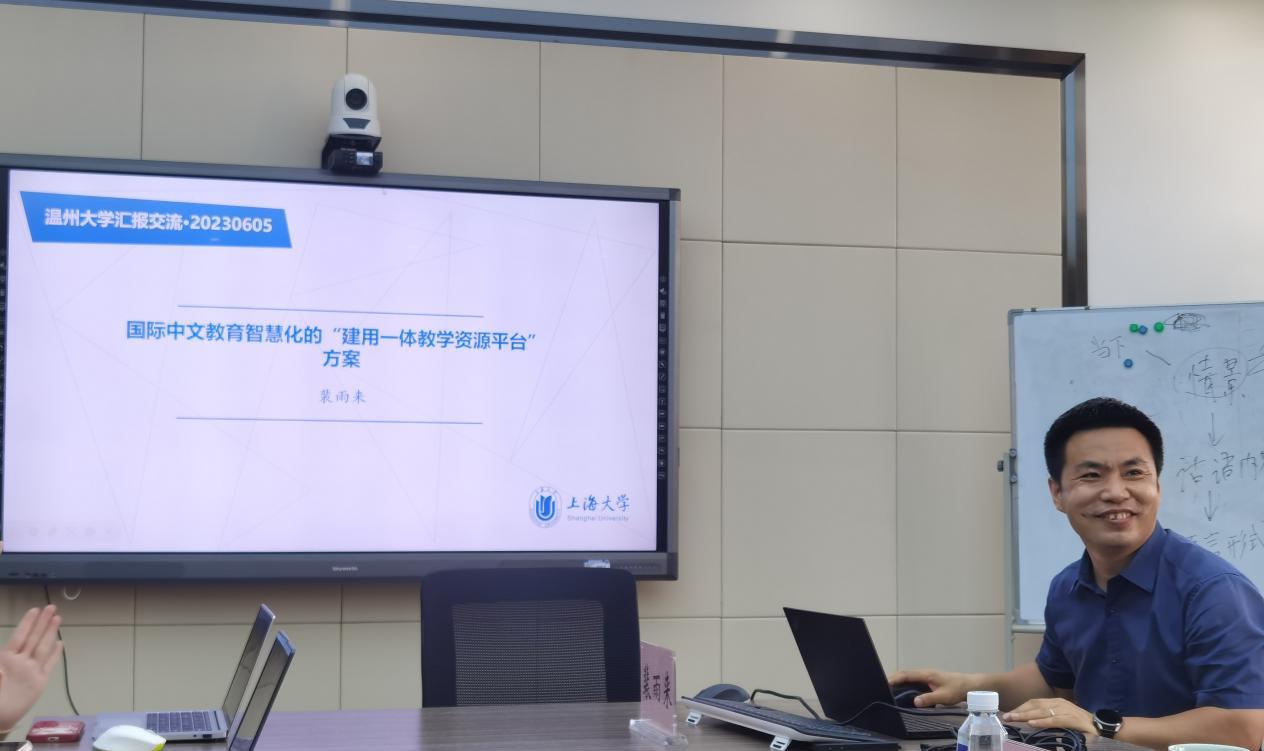 进行学术交流。接着裴教授从自身的教学实践经验出发,向在座师生介绍了目前存在的两类教学资源,以及支持教学实施的教学资源建设的六条原则,同时也指出了教学资源建设已有方案的现状与不足,并针对不足提出了国际中文教育智慧化的“建用一体教学资源平台”方案。讲座最后,裴教授向我们演示了如何使用上海大学的“建用一体资源平台”来进行国际中文教学的备课。