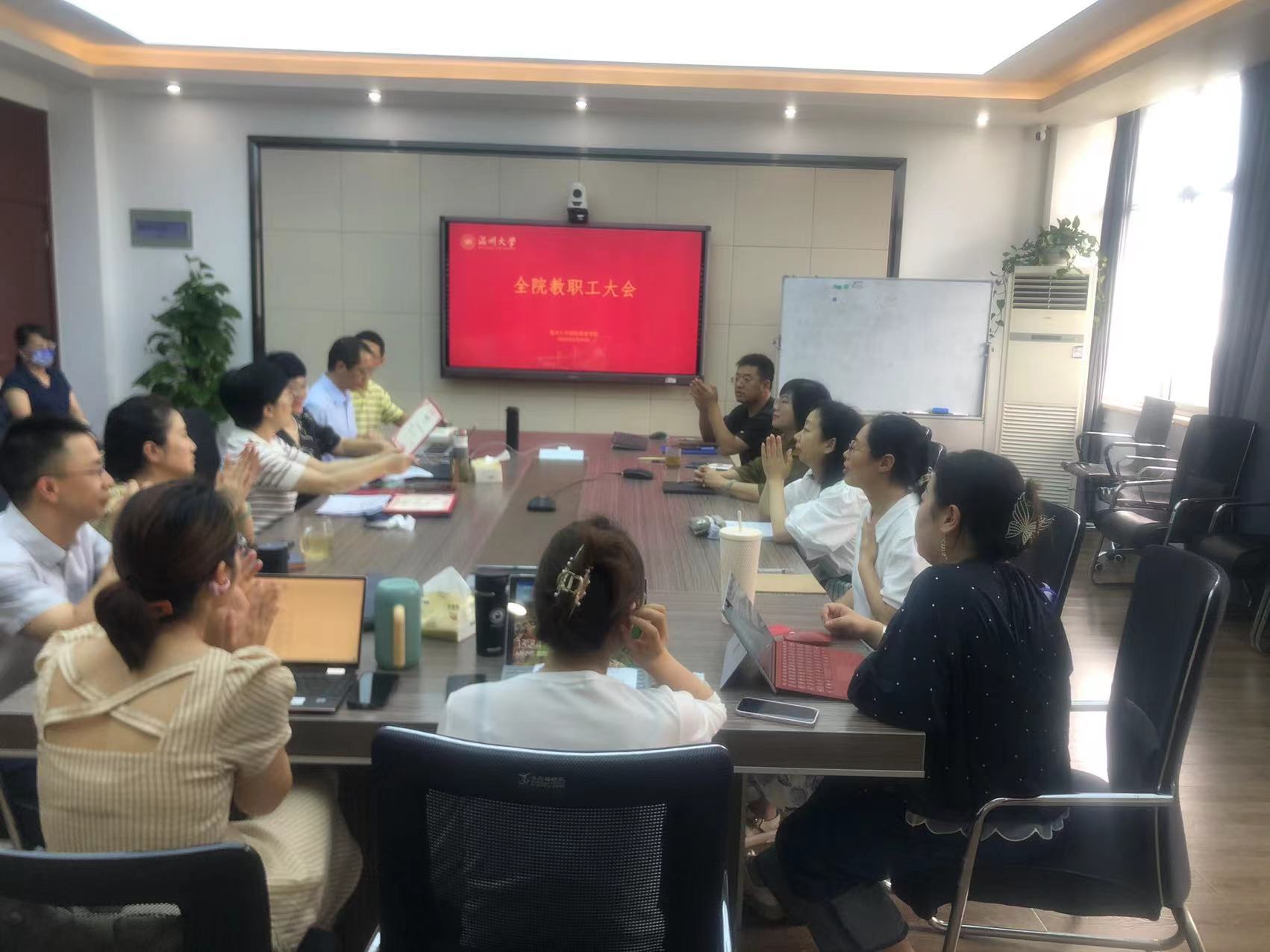 会议举行了阚文文老师欢送会。阚文文老师将奔赴泰国东方孔子学院任教,学院肯定了阚文文老师为学院所作的贡献,勉励其在海外讲好中国故事,传播好中国文化。