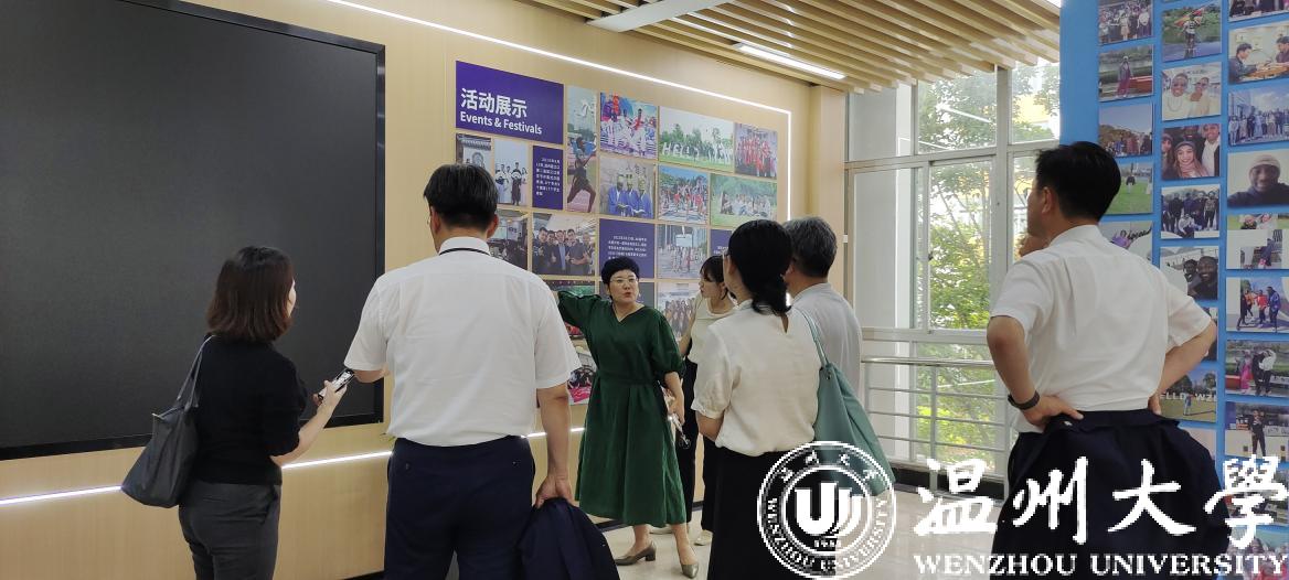 首先,宋占美院长陪同代表团一行参观了学院国情教育馆,向客人简要介绍了温州市情以及学校、学院的发展历程,生动讲解了温州大学国情教育工作室校内基地建设及国情教育活动的开展情况。带领代表团参观了学院文化墙,重点介绍了捷报比分概况
