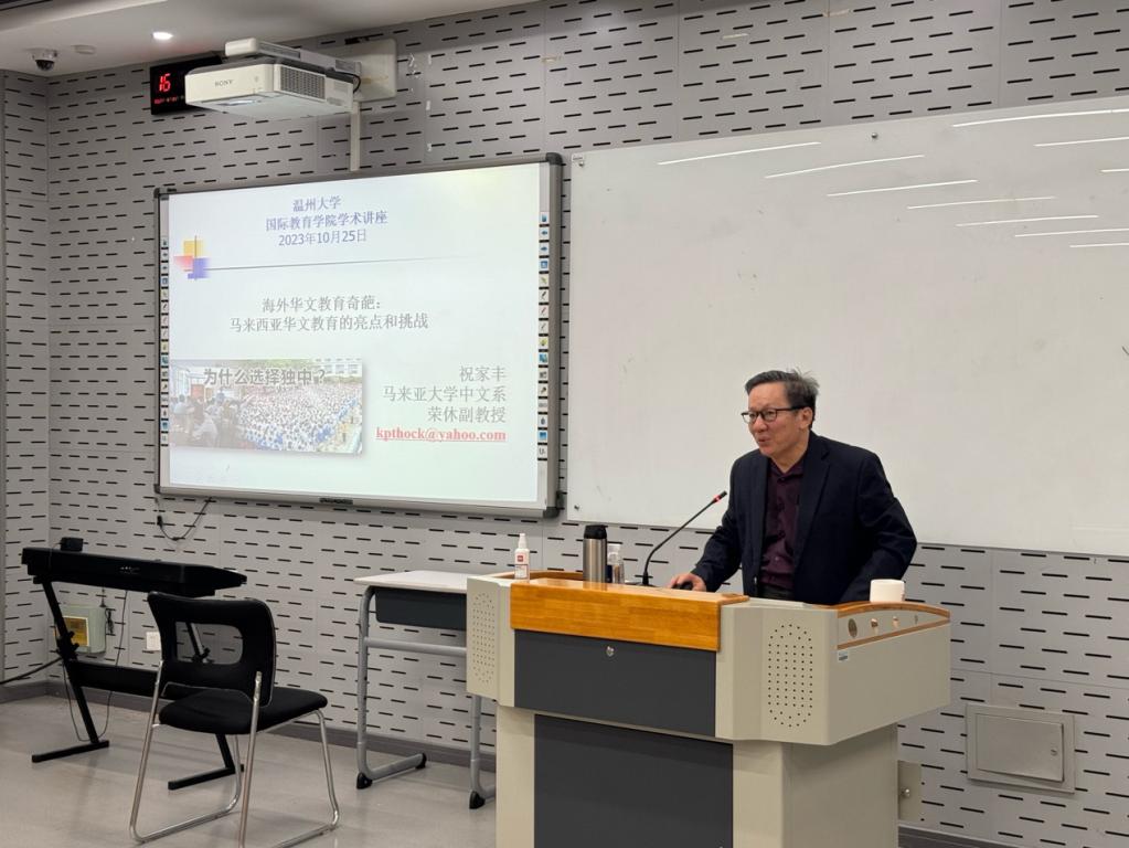 祝家丰教授从马来西亚的多年教学研究的实践中,分享了对马来西亚华文教育的亮点和挑战。祝教授首先介绍了马来西亚华文教育的情况,提到马来西亚的华文教育体系在中、港、台外是发展得最完善的国家或地区,并且由于华文小学优质的教学质量,绝大多数的华裔家长都会将子女送进华文小学。接着祝教授介绍了华文教育的历史进程,马来西亚华人具有儒商精神,饮水思源,社会各界人士在面对政府的高压下不畏强权,为华文教育奋斗一生。最后分享了马来西亚华文教育的现状以及挑战,如政府颁布了一系列不发展华语教育的政策,华文教育还需要面对国际大环境、英语至上的挑战等等,引发了老师同学们的思考。