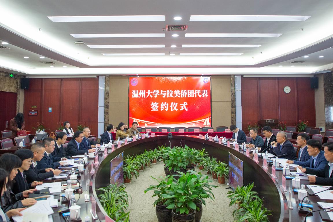 2023年11月28日,秘鲁通惠总局主席沈达坚、秘鲁浙江总商会会长楼兵强、秘鲁温州工商总会代会长张剑英、智利温州同乡会名誉会长林良松、墨西哥中华青年联合会副会长陈温畅等拉美侨团代表一行9人访问温州大学,就促进中国与拉美地区教育交流、侨界合作举行会谈,并就国际学生定向招生、校企合作联合培养签署合作协议。温州市侨联副主席路驰、瓯海区侨联党组书记翁蔡恩、主席秦毅出席活动,温州大学党委书记张健、副校长蔡曙光、捷报即时比分网